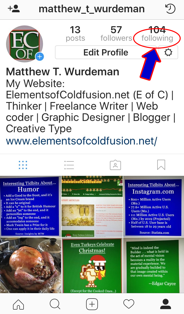 (Figure 3. Screenshot of my profile section on Instagam app. Credit – Instagram. The “following” link is located at top right of the screen.)