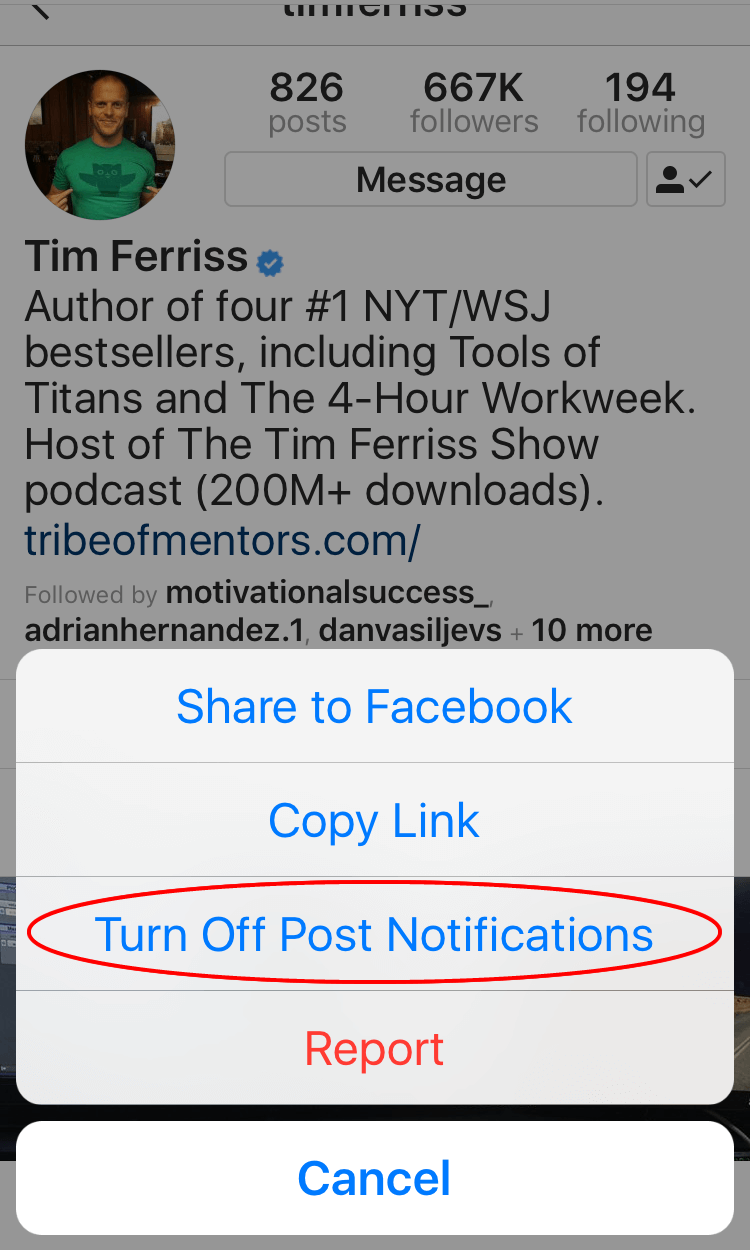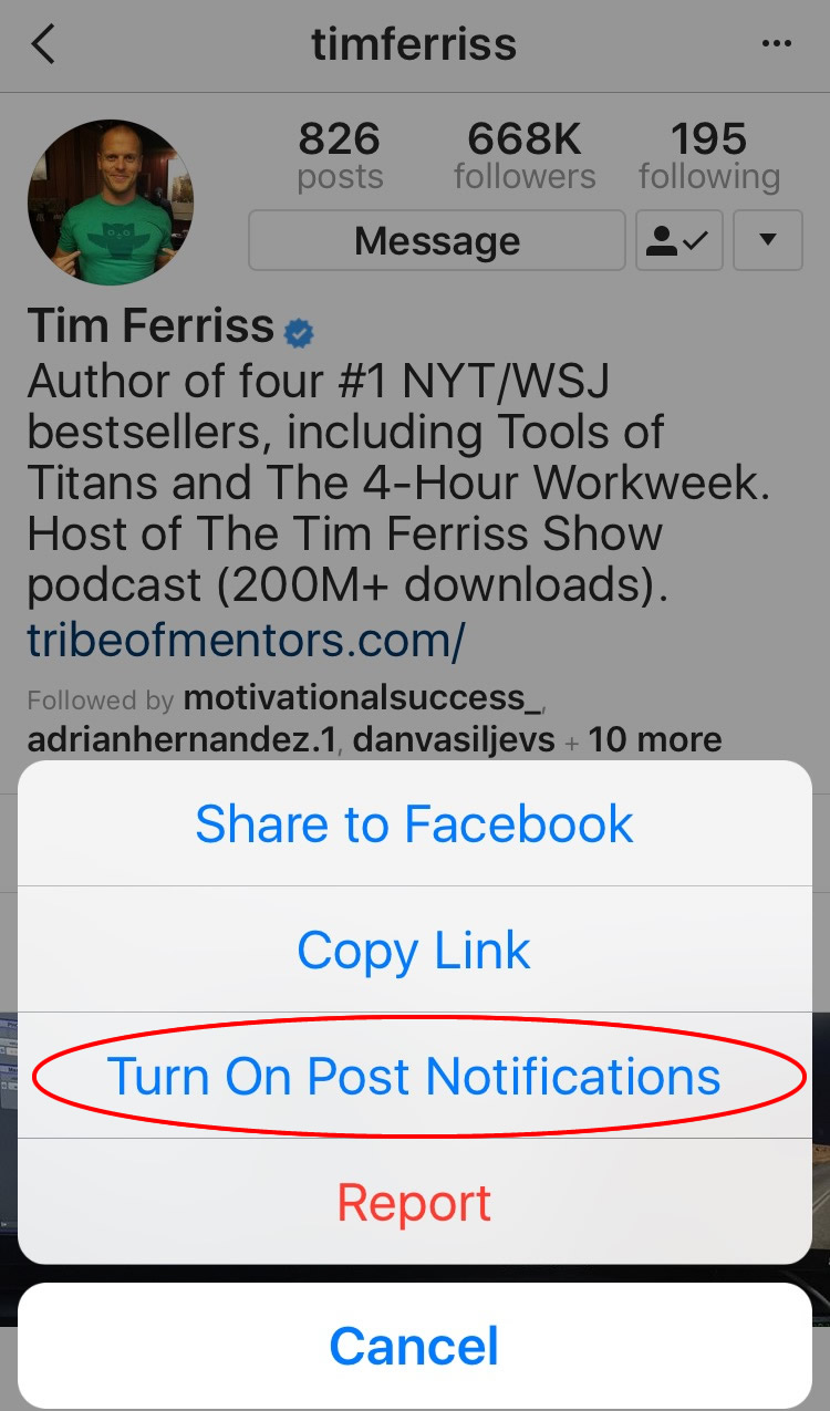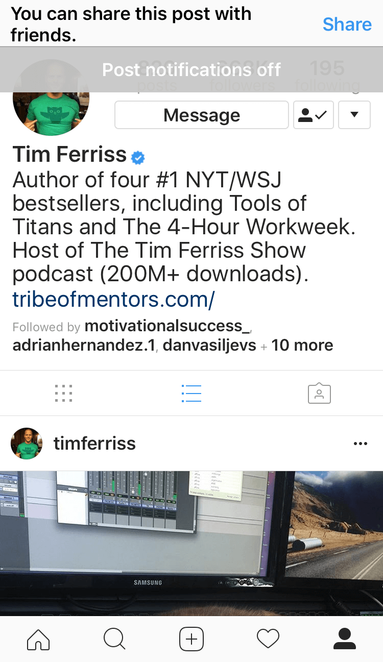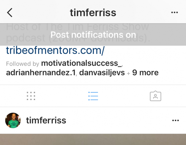 Here are some tidbits about setting up post notifications, so the “apples of your eye,” — aka — favorite people (**cough** Tim Ferriss) you follow are delivering you those fresh photos, videos, and stories. Why is this so important a tidbit of info, you ask? Because, as soon as they post, you will get a message. Yes, it’s the power of PUSH notifications at work!
